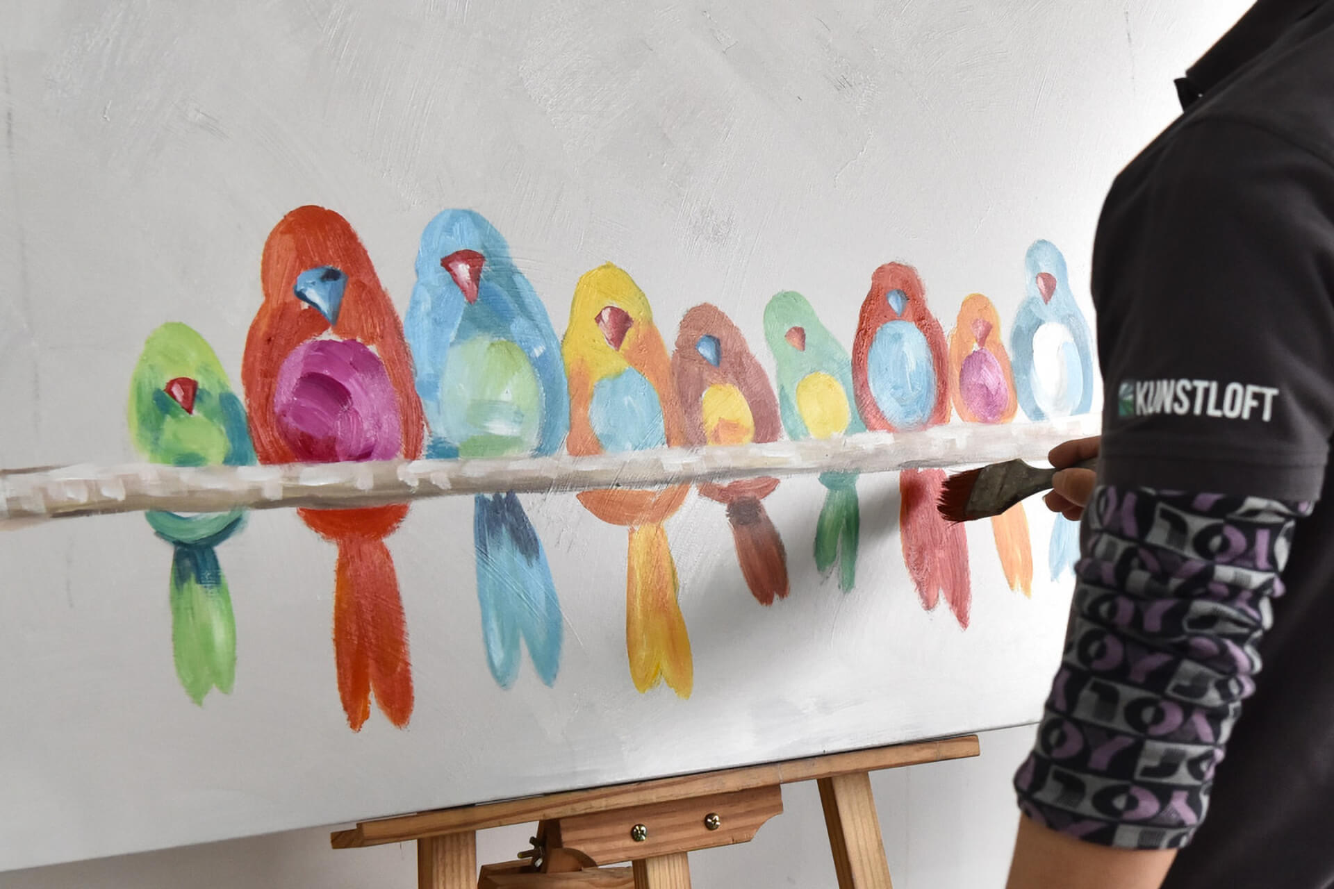 'Freunde fürs Leben' ist ein Gemälde voller Harmonie. Zwölf Vögel die aneinander geschmiegt auf einem Ast sitzen und einfach nur das Beieinandersein genießen. Unterschiedlicher könnten die Vögel kaum sein - in allen möglichen Formen und Farben - doch das ist nicht von Bedeutung. Erinnern Sie sich jeden Tag an das Gefühl wahrer Freundschaft! Ihr handgemaltes Gemälde erhalten Sie in der Größe 120x60cm. Anders als bei minderwertigen Drucken auf Leinwand können Sie auf unseren Unikaten jeden Pinselstrich fühlen. 0 Oil painting 1 Ölgemälde Handmade Quality 2 2