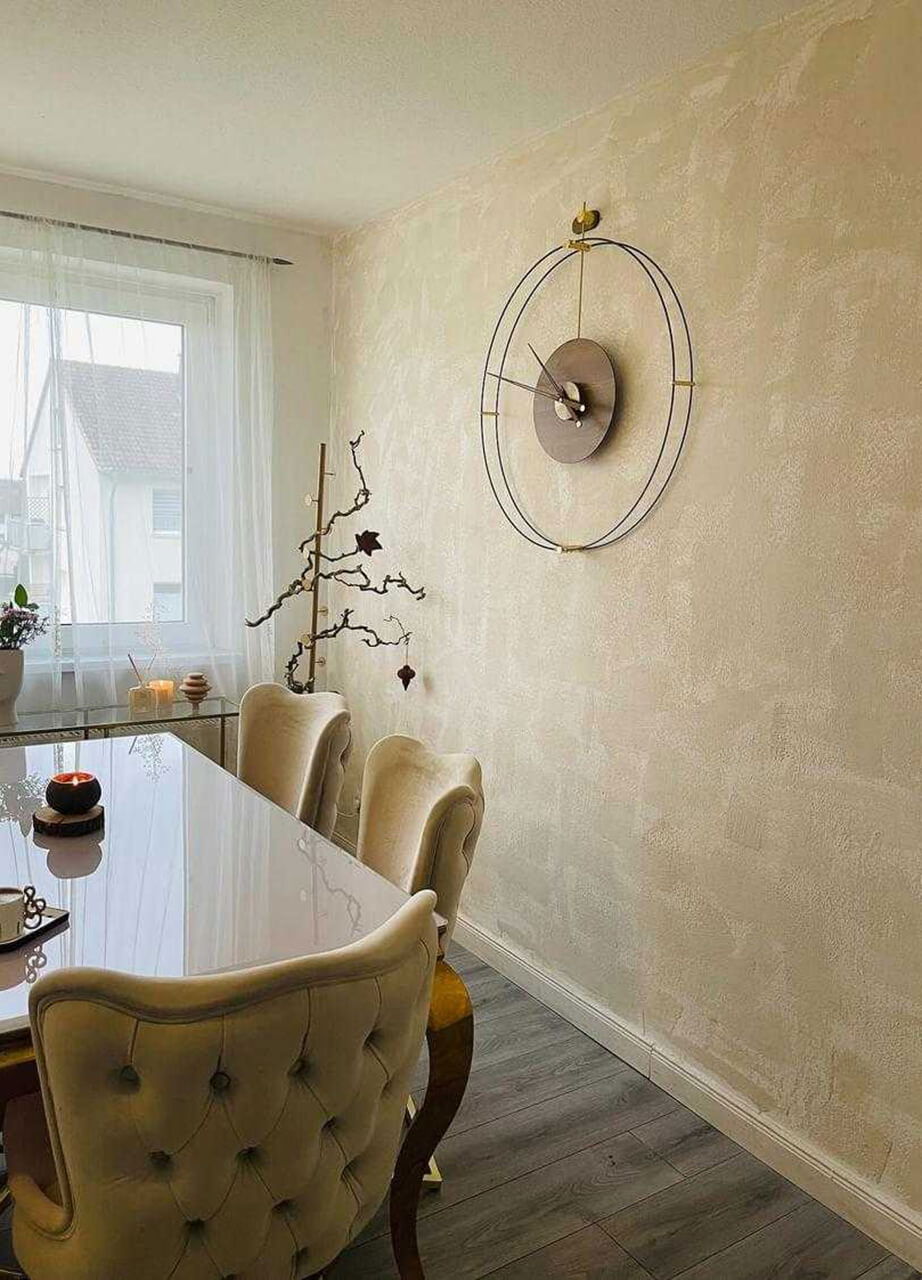 A practical suspension system is on its back. This allows you to quickly and safely hang your new decorative clock on your wall. The required AA battery is not included in the delivery.