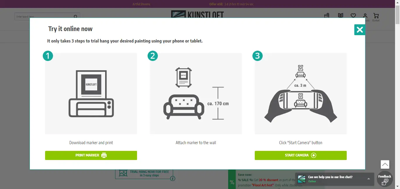 - Digital templates: KunstLoft offers a free online 3-step trial hanging application that allows you to test and try how your paintings will look in your chosen hanging area.